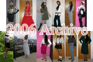 Follow this link to see my 2006 images: the gold and snakeskin outfit, Anthy the Rose Bride, the green tank dress, the white sweater with flare jeans, the lilac pantsuit, the PVC can-can girl, the pink summer outfit, the white linen dress, the magenta skirt school teacher, the black and gold sailor-style schoolgirl uniform, a night out at the bar, and the green holiday suit.