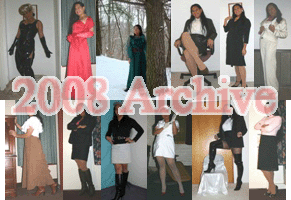 Follow this link to see my 2008 images: the fetish Tsarina, the red ball gown, the maiden of spring, the brown leather skirt suit, a basic black dress, winter white pinstripes, romantic ruffles, a dark denim outfit, a little French accent, the PVC nurse, the dominatrix bride, and a chenille sweater.