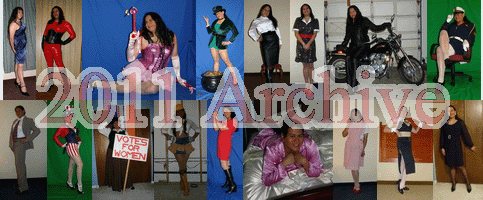 Follow this link to see my 2011 images: the ideeli dress, the PVC catsuit, Cupid, the leprechaun, the hobble secretary, the PVC '50s dress, the black leather motorcycle outfit, the marine girl, the Navy girl, the ugly tie pantsuit, the Uncle Sam outfit, the suffragette, the construction worker, the Star Trek girl, the pink pajamas, the candystriper, the pilgrim, and another little black dress with sheer sleeves.